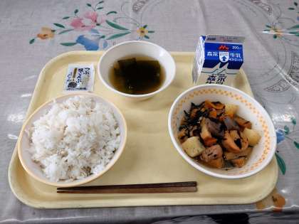今日は、麦ごはんと塩こんぶのふりかけ、いそ煮とすまし汁でした。