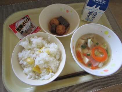 くりごはん、のっぺい汁、丸天のふくめ煮、黒糖ビーンズ、牛乳 です。