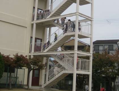火災避難訓練を実施しました。3階の理科室からの出火想定です。