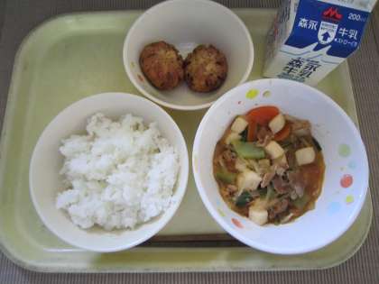 ごはん、とうふチゲ、パオシュウ、牛乳 です。