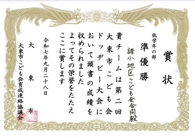 第2回大東市こども会ドッヂビー大会で、諸小地区こども会合同チームが、低学年の部「準優勝」