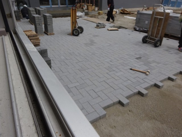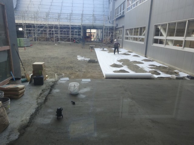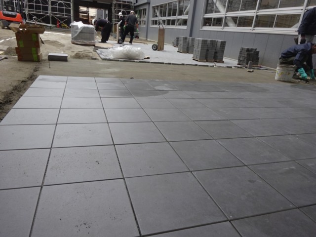 ラーニング・リビングの中庭に、インターロッキングブロックが敷かれています。