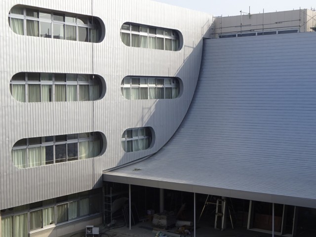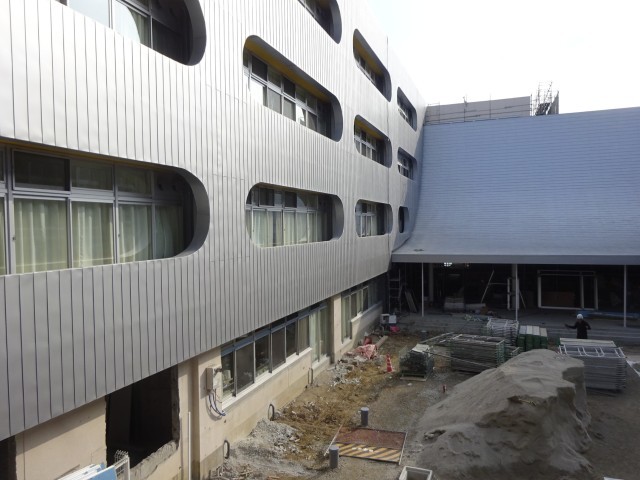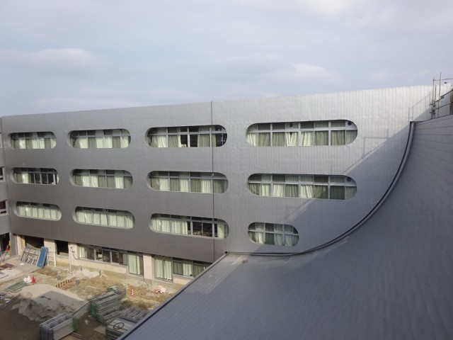 北校舎の工事用シートがすべて外され、ガルバリウム鋼板の外壁が姿を現しました。