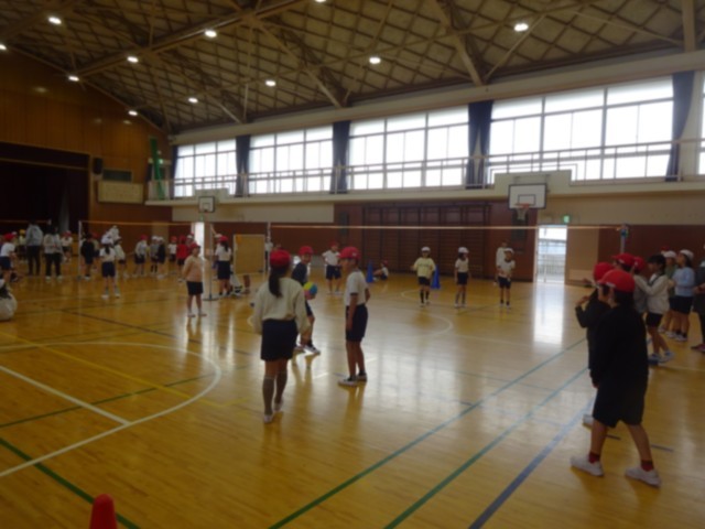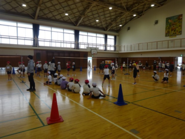 体育の授業で学習したボールのキャッチ、パスを使って、学年で競います。