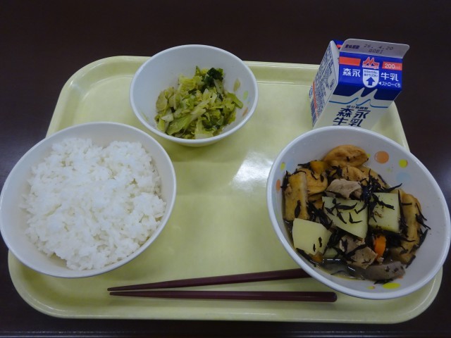 今日のメニューは、ごはん、いそに、おひたし、牛乳
