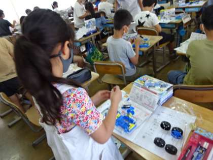 電池でモーターを動かして走る自動車を作っています。電気を通すとファンや車輪が回って、おもしろいですね。