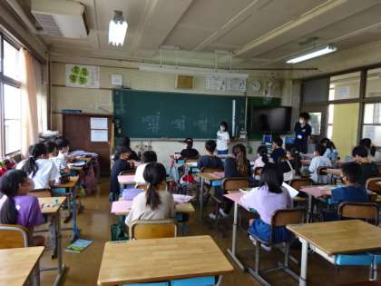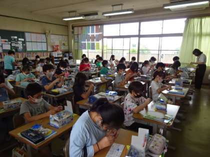 4年1組は電気でうごく車のおもちゃを作っていました。2組は静かに読書。3組は算数で、1人の児童が黒板の前で解き方を説明していました。黒板の字が大きくてとてもしっかりかけていたので、感心しました。