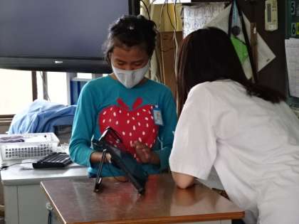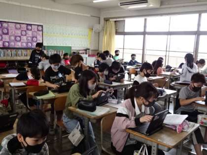 3組をのぞくと、教室では各自で作ったタブレットの画面を使いながら英語で話す練習をして、一人ずつ順に英語専科の先生と受け答えの練習をしていました。このあと廊下へ出てAETの先生の質問(英語です)に対して、英語で答えるテストを受けます。この様子は録画して、あとで評価を付けるときに記録として役立てます。