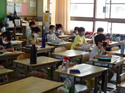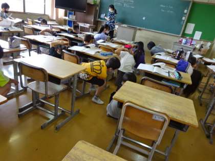 分割で「ながさ」の勉強をしていました。少人数教室の写真は、机の高さを物差しで測っているところです。
