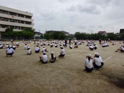 全学年で練習してきたリズムジャンプを、これから毎朝2学年ずつ順番に運動場でとりくみます。距離をとって身体能力の向上のために実施しています。初日の今日は、朝からの雨がやんで涼しく、運動場の土も湿ってホコリがあがらない、ちょうどいい状態でした。