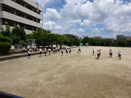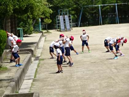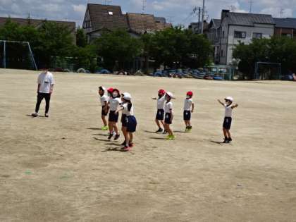 2年生ながら、リーダーが「1,2,3,4」と掛け声をかけると他のみんなが「5,6,7,8」と続けながら体操をしています。自分たちでやろうというところが気持ちがいいですね。