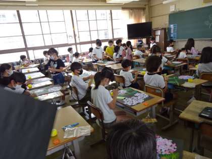 3年1組では、絵の具をにじませた白い紙を花の形に切って貼り付けてあじさいの花の絵を作っていました。同じようなやり方でも、一人一人違った感じの花ができて、どれもとてもきれいでした。