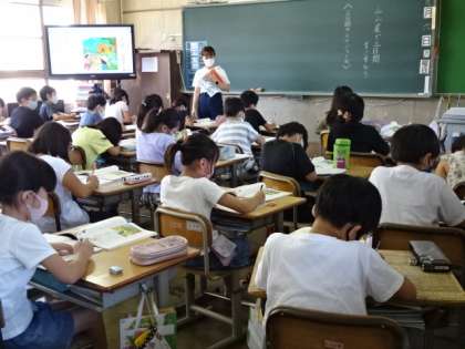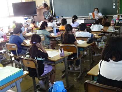 3−1では、「山小屋で3日過ごすとしたら」という条件で予定表を作っていました。3−3では、先生が教科書を範読しているのを静かに聴いていました。