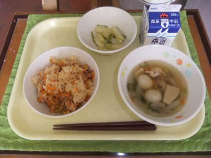 今日の献立は、豚キムチご飯 中華スープ じゃが芋ソテー 牛乳です。
