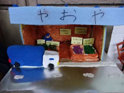 1つ目は八百屋の店先のジオラマです。紙粘土で商品も作っています最近はこんなお店もめっきり少なくなってきました。値札なども一つひとつ手作りで、いい味を出していますね。