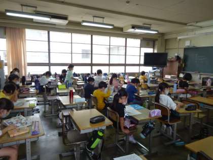 3−2は算数、3−3は図書でした。好きな本を借りたらそれぞれに教室に戻って静かに本を読んでいます。