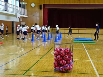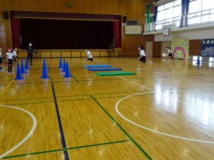 体育館で、いろいろ道具を出して、競技をしています。みんな全力ですね。