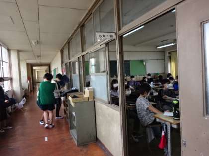 1枚目。6−1の教室前にいる子らは、作品掲示用のフォルダを新しいクラス別に分けるお手伝いをしています。朝早くからご苦労様。