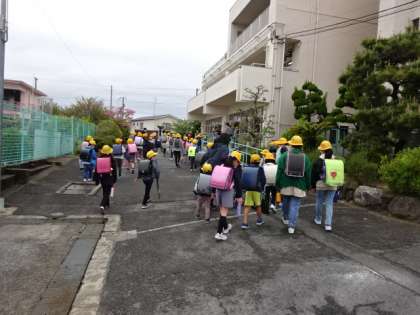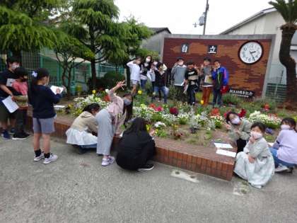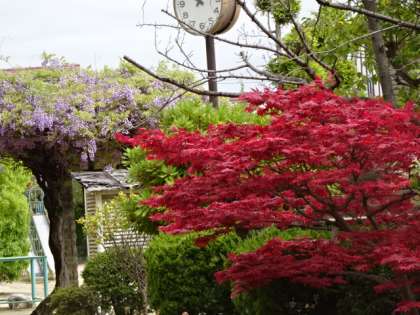 朝には雨上がりのしめった道を登校してくる子たち。運動場には藤の花と楓の赤い葉。午後には子どもたちが元気に春の花をスケッチしていました。