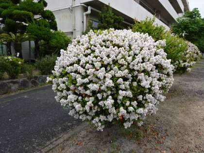 校門を入ったところに白い花がめいっぱい咲いてボールのようになっている木があります。何の木かなと思って調べると「ライラック」のようです。花言葉は「無邪気」ですって。