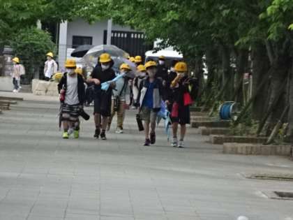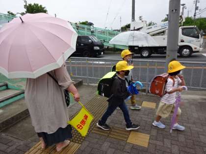 今日は、登校時、ちょっと雨が降っていました。今日も歩道橋のところでPTA見守り委員さんが登校を見守ってくれています。ありがとうございます!