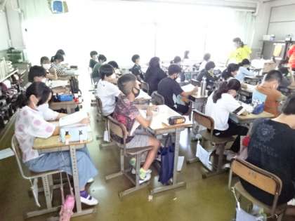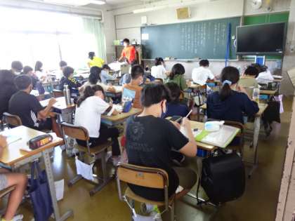 机の上に水筒があります。熱中症予防のために、授業中でも水分補給をしてもいいことになっています。まだまだ暑いですから…