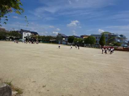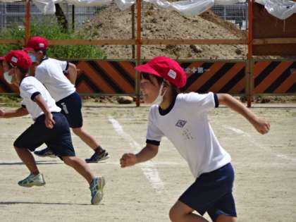 午後の運動場。1年生がかけっこをしていました。よく晴れていて暑いので、体育の授業は、途中でこまめに休憩と水分補給します。早く涼しくなってほしいですね。
