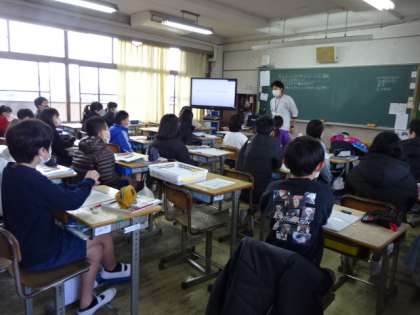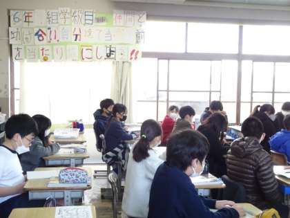 社会の授業に一生懸命取り組んでいます。教室の後ろの方には1学期に決めた「学級目標」があります。もう少しで卒業ですが、目標は達成できたかな?