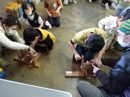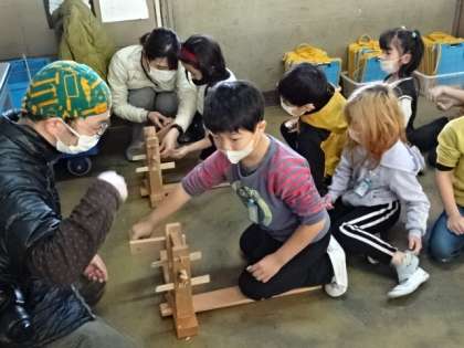 1年生は国語で「たぬきの糸車」という物語を教材に学習するのですが、そこで出てくる「糸車」の実物を見せてもらいました。この3枚は、綿の実から種をとる機械です。「種が6個も入ってた!」と見せてくれた子がいました。これを植えると、花が咲いて、また綿ができるのですよ。