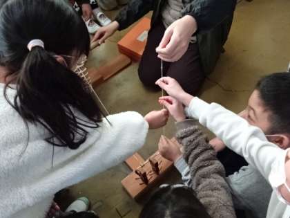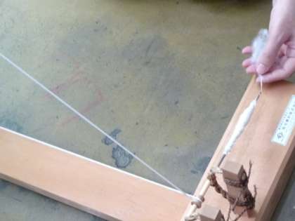 さて、こちらは「糸車」です。私もアニメなどで見たことはありますが、実物が動いているのを見るのは初めてです。糸車を見ていると不思議なことに綿がどんどん糸になっていきます。これは確かに、面白い!