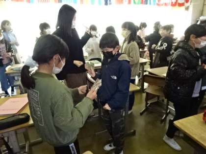 楽しそうですね。みんな、何種類か混じったカード5枚ずつを持って、同じ絵柄のカードを4枚集めるのだそうです。まず、"Hello!"とあいさつして、英語でジャンケン。負けた人が勝った人に"What do you want?"と聞いて、勝った人が"I Want ○○."とほしいカードの絵柄を答えます。負けた人がそのカードを持っていたら相手に渡し、なければ"Sorry〜."と言って別れるのだそうです。みんな夢中でカードを集めています。すべて英語です。すご〜い!4年生です。
