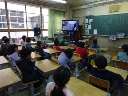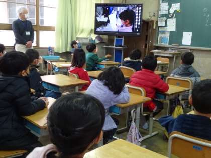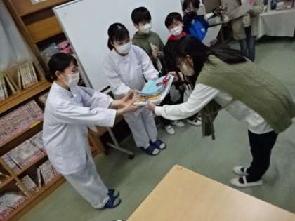 図書室で給食調理員さんにお礼のプレゼントを渡す様子を、各クラスからリモートで見ました。