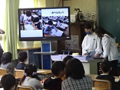 学校生活の写真をディスプレイで表示しながら説明してくれています。これからはこんな風に「おべんきょう」や「そとあそび」をするんですよ。
