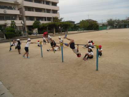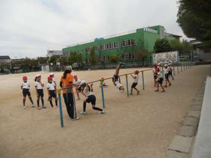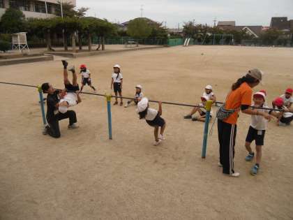 先生に教えてもらいながら、鉄棒の逆上がりに挑戦していました。