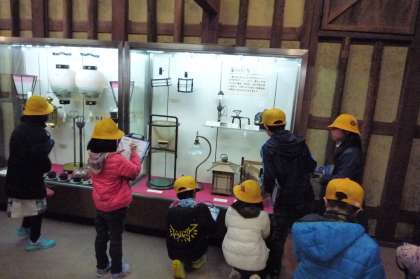 子どもたちは展示された昔の道具などをよく見て、記録したりしていました。