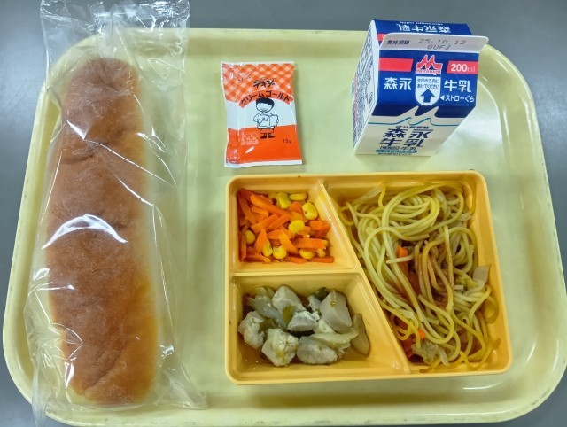 今日の給食は、コッペパン、焼きスパゲティ、鶏のゆずこしょう炒め、にんじんサラダ、ミルクバター、牛乳です。