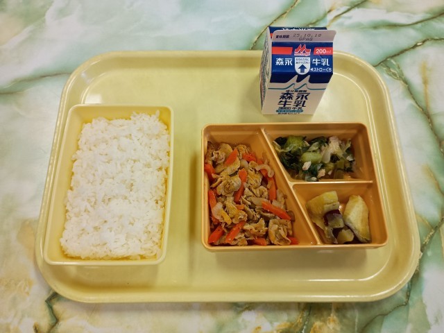 今日のメニューは、白ごはん、豚肉のバーベキュー炒め、チンゲン菜のサラダ、さつまいもの甘煮、牛乳です。