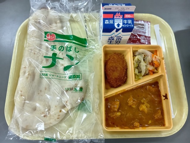 今日の給食は、ナン、バターチキンカレー、コーンコロッケ、野菜炒め、ミルメークココア、牛乳です。