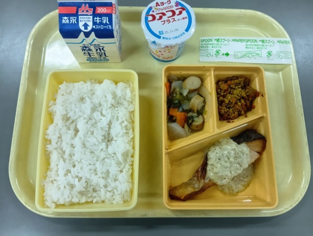 今日の給食は、ごはん、鮭のマヨネーズ焼き、かぶのスープ煮、カレーそぼろ、ヨーグルト、牛乳です。