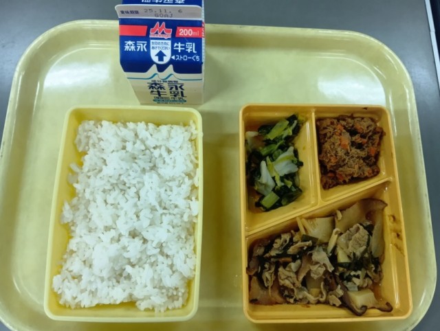 今日の給食は、ごはん、豚肉のオイスターソース炒め、小松菜の和え物、かつおそぼろ、牛乳です。