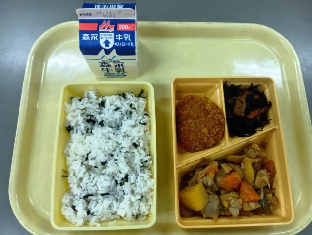 今日の給食は、わかめごはん、炒り鶏煮、国産キャベツメンチカツ、ひじきの煮物、牛乳です。