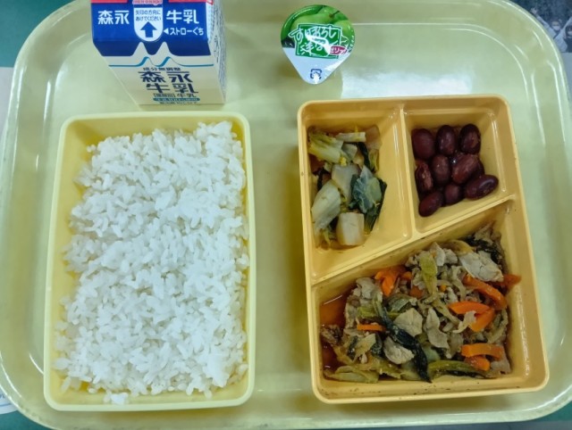 今日の給食は、ごはん、豚肉のビビンバ風、白菜のおかか、金時豆の煮物、プチすりおろし洋ナシゼリー、牛乳です。