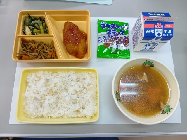 今日の給食は、もち玄米ごはん、米粉ささみカツソースかけ、きんぴらごぼう、小松菜のしらす和え、おさつスティック、豚汁、牛乳です。