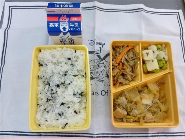 今日の給食は、わかめごはん、とりすき焼き風にこみ、ごぼうサラダ、じゃが枝豆、牛乳です。