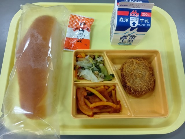 今日の給食は、コッペパン、鮭メンチカツ、マカロニのケチャップ炒め、チンゲン菜の炒め物、ミルクバター、牛乳です。