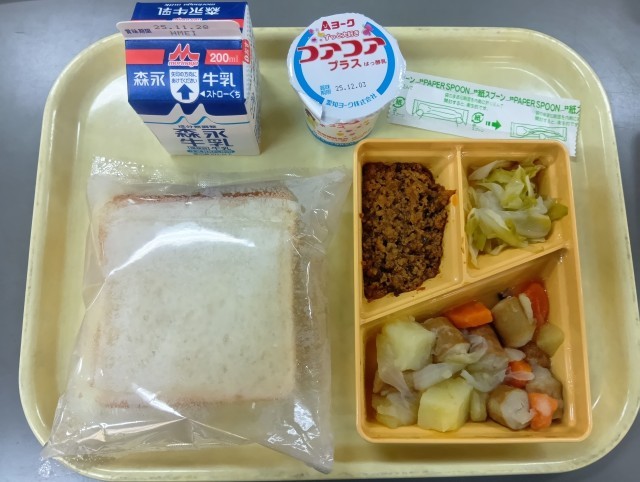 今日の給食は、食パン、ポトフ、ミートサンド、キャベツソテー、ヨーグルト、牛乳です。