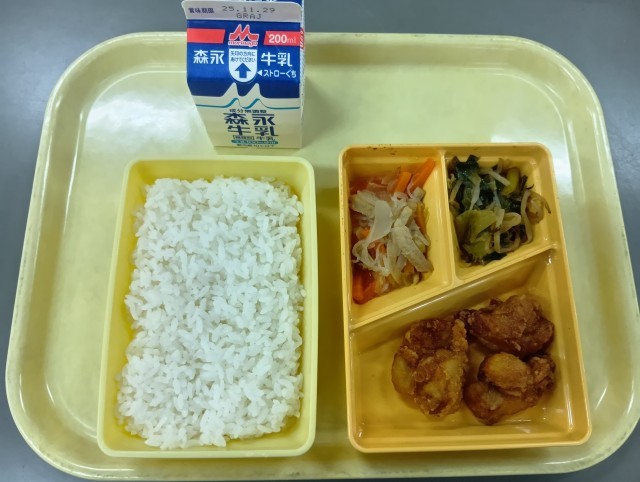 今日の給食は、ごはん、鶏肉の唐揚げ、こんにゃくのチャプチェ、ナムル、牛乳です。
