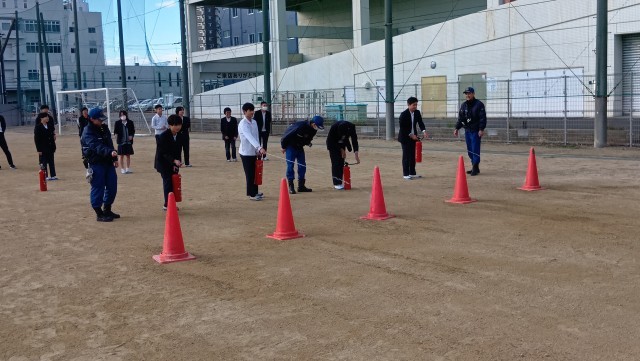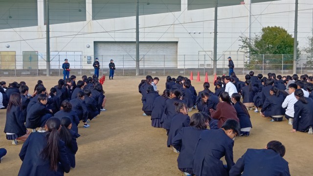 6時間目に、火災を想定した避難訓練を実施しました。大東四條畷消防本部の方にもお越しいただきました。今回の訓練では、出火場所を特定の職員をのぞいて、避難放送が入った時点で全員が知り、安全な経路で避難する、という取組みも行いました。全員安全な経路で避難できました。