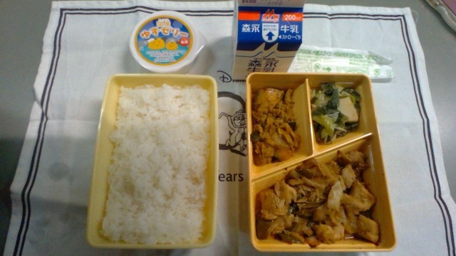 今日の給食は、ごはん、鶏のホイコーロー、かぼちゃと豚肉のカレー風、チンゲン菜とえのきの和え物、ゆずゼリー、牛乳です。
