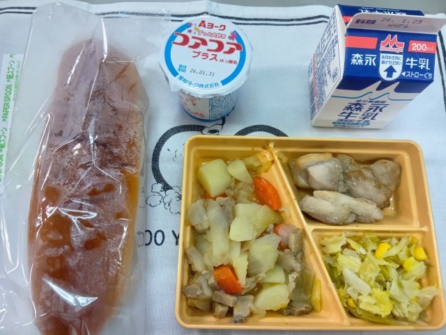 今日の給食は、黒糖パン、ベーじゃが、鶏肉の香草焼き、キャベツとコーンのサラダ、ヨーグルト、牛乳です。